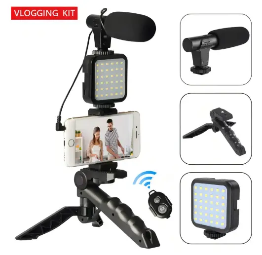 Tu estudio de grabación portátil. Un set completo que incluye trípode, iluminación LED ajustable y micrófono de alta fidelidad, diseñado para creadores de contenido que buscan calidad profesional en sus videos y transmisiones.